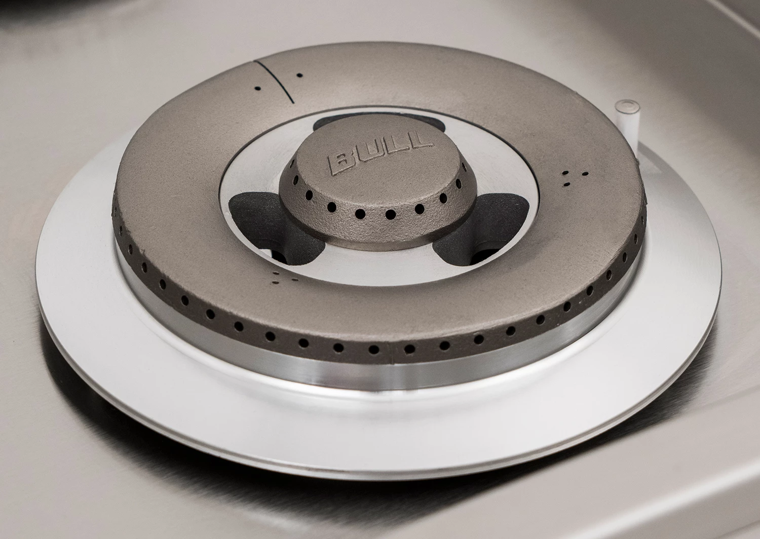 Die beiden separat regulierbaren Brenner bestehen aus massivem Messing und verfügen mit zusammen 6,4 kW über richtig viel Leistung. Gezündet wird die BULL Seitenkochstelle per Piezo-Zündung und ist damit komplett unabhängig von einem Netzanschluss.