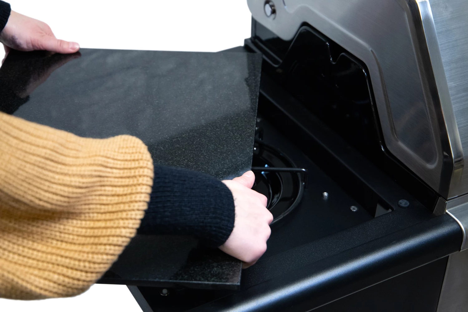 Wird der Seitenkocher mal nicht benötigt, wird er einfach die Granitarbeitsplatte wieder eingelegt, so dass die Seitenablage vollständig als Ablagefläche verwendet werden kann.
