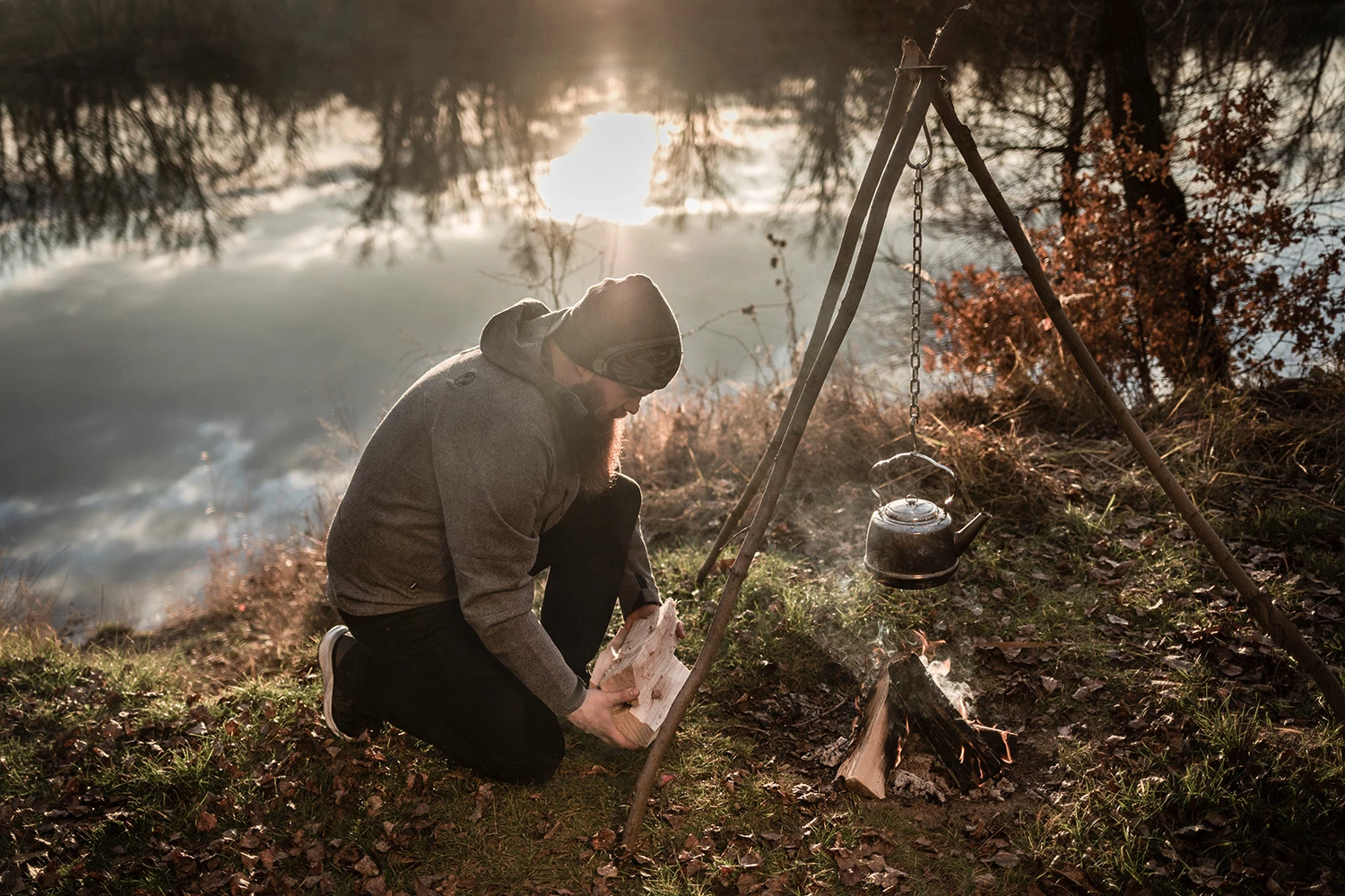 Mit den zwei Haken und der Kette lassen sich nun Feuertopf oder Teekessel über der Feuerstelle aufhängen. Die Hitze regeln Sie über die Kettenlänge.